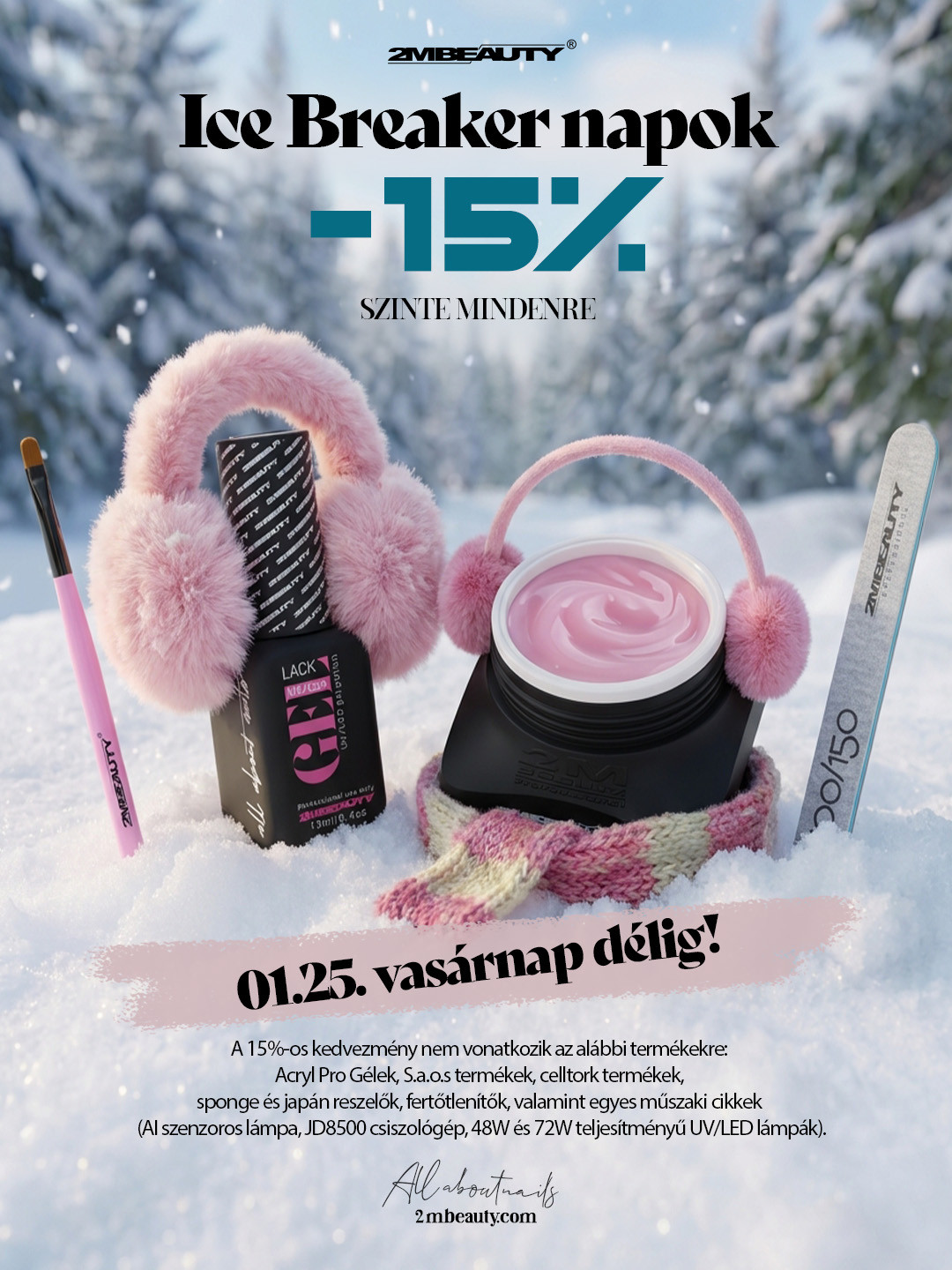 A kedvezmény nem vonatkozik az Acrylic Pro Gel-ekre, S.A.O.S termékekre, celltorkra, sponge és japán reszelőkre, fertőtlenítőkre, valamint egyes műszaki cikkekre (AI szenzoros lámpa, JD8500 csiszológép, 48W és 72W UV/LED lámpák).